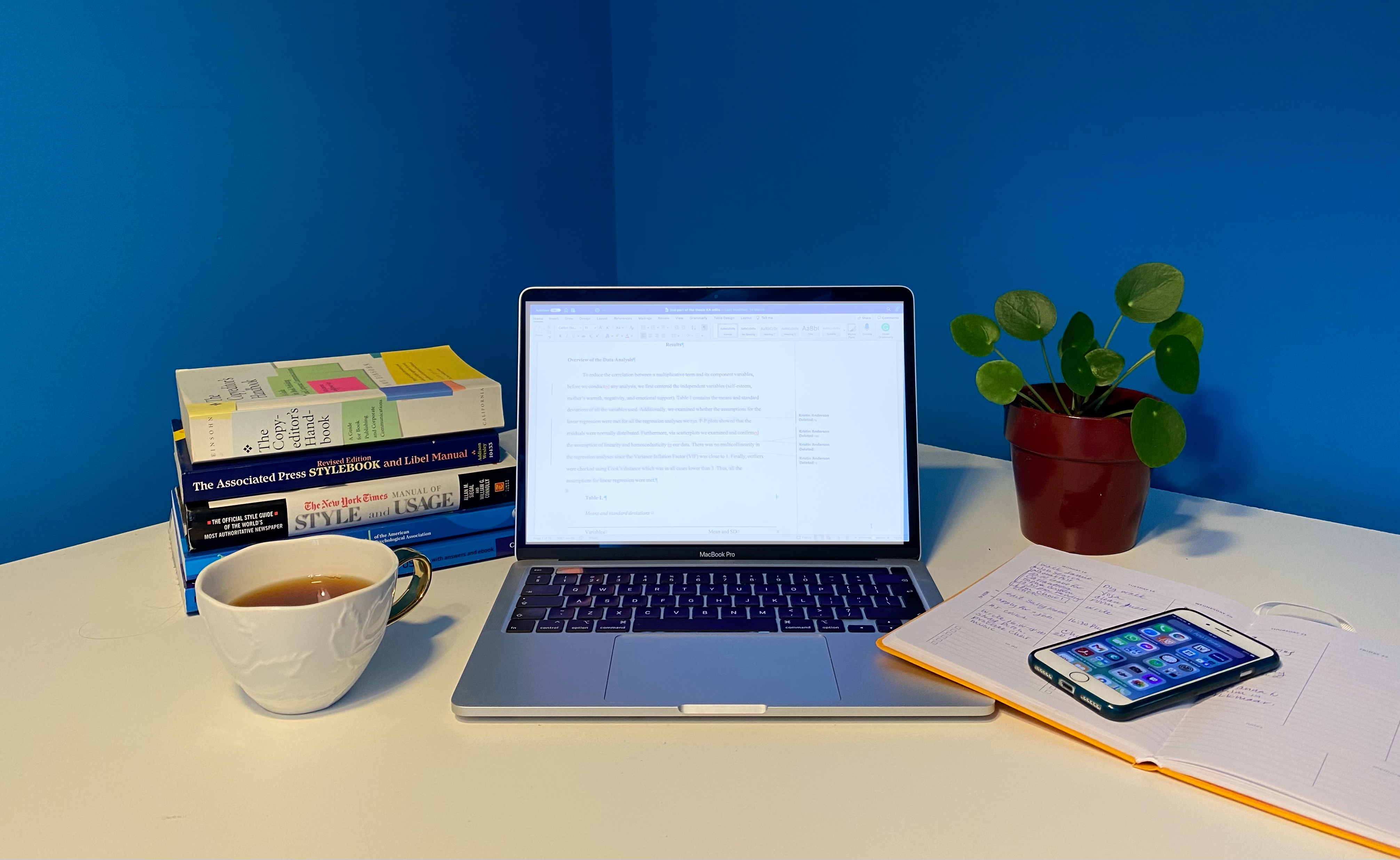 Copyediting: checking for clarity of meaning, consistency of tone, style, and flow, word usage, spelling and grammar, as well as light structural editorial feedback.