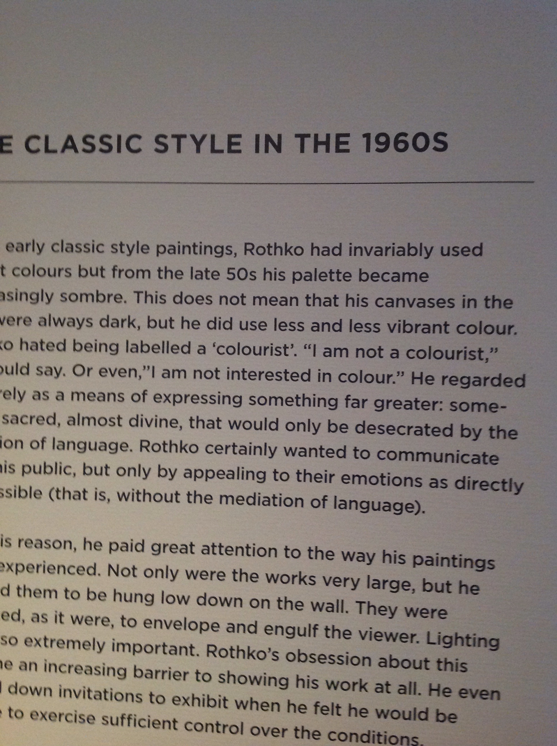 My tendency, as a social female and a writer, is to write about the art I see and to discuss them in terms of color and shape. But as I read about the artist, I soon realized he had an aversion to people trying to convey his art through words. Words, according to Rothko, desecrate the art. And they are not about color either; they are about the emotions; about a personal relationship between the painting and the viewer and the emotions that are evoked. They are intentionally hung low on the wall, so the viewer can “step into” the painting, and really experience the art.