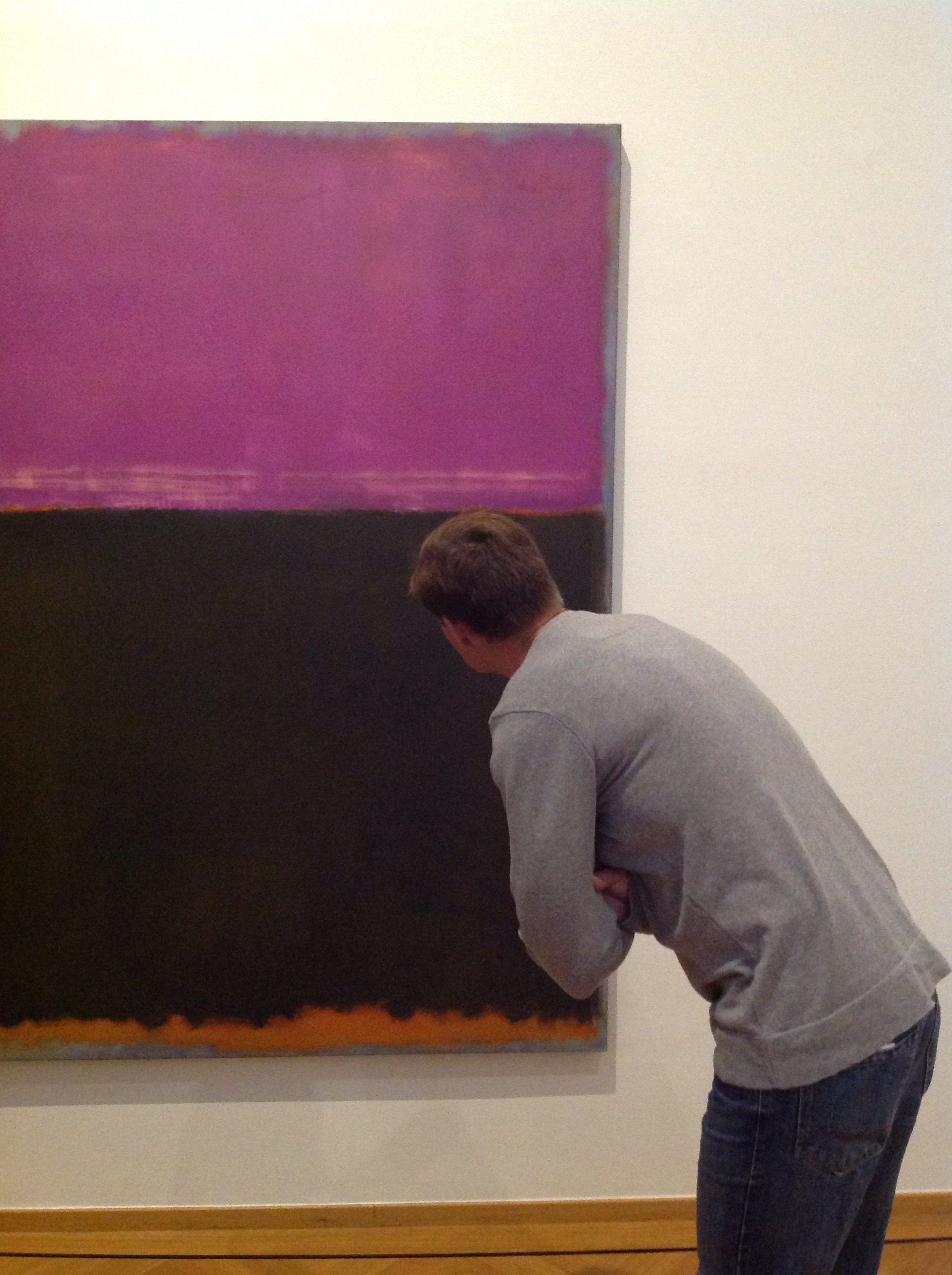 What was Rothko striving for in his paintings? As observers, we like to discuss the art. Take this man for example; he stood before the painting, gesturing with his hands, explaining a concept to his son–a concept that was not laid out in the untitle of the painting or in the curator’s interpretation of the art, as these were rather non-existent.