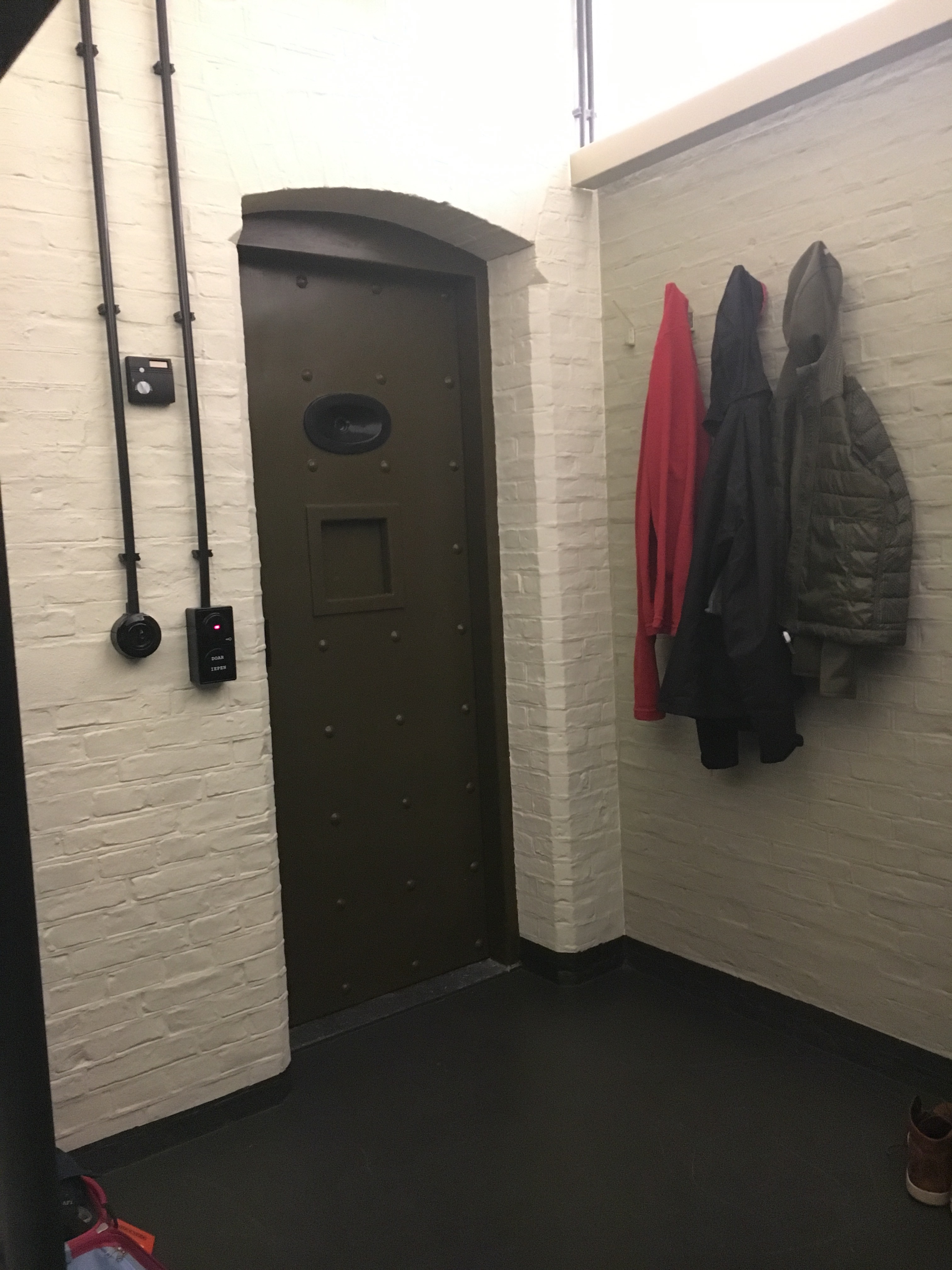 In the morning, I ran into another guest who was visiting from just outside Utrecht. He and his family of four had nabbed two private rooms with double beds. He found the whole concept great and was impressed with the renovation. He’s pictured here relaxing in a small lounge next to a wall of barred windows. They slept just fine, by the way.
