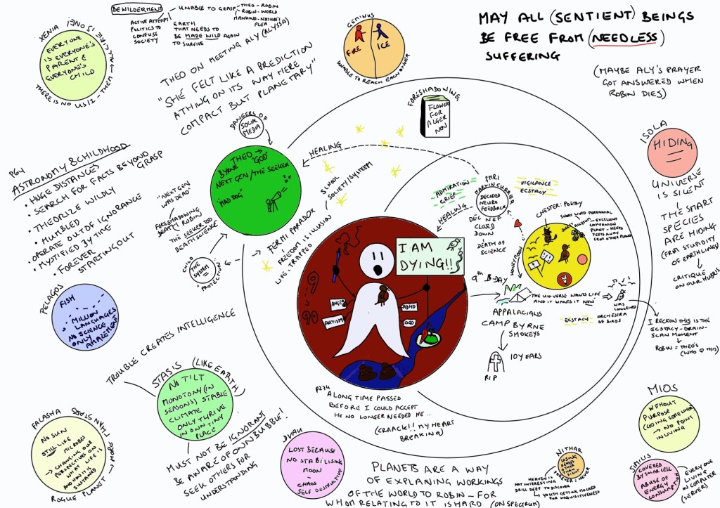Remember how this post started? Discussing reading passages with others can expand your understanding? A few days after the book club gathering, Paulina (deKoning) Vanderbilt, a treasured member who wasn’t able to attend that day, shared her thoughts on the book, along with her conjectures on what all those mini-stories of planetary journeys could be about. Paulina is a teacher, an environmentalist, and a highly creative person, so naturally, she didn’t just send us a WhatsApp with her thoughts. She came up with an artistic poster to pull that aha moment out of said black hole and bring Theo’s (Richard Powers’s) chaos into order. With her permission, I am sharing Pauline’s drawing here, which extended the discussion and our level of understanding. Be forewarned: It contains spoilers.